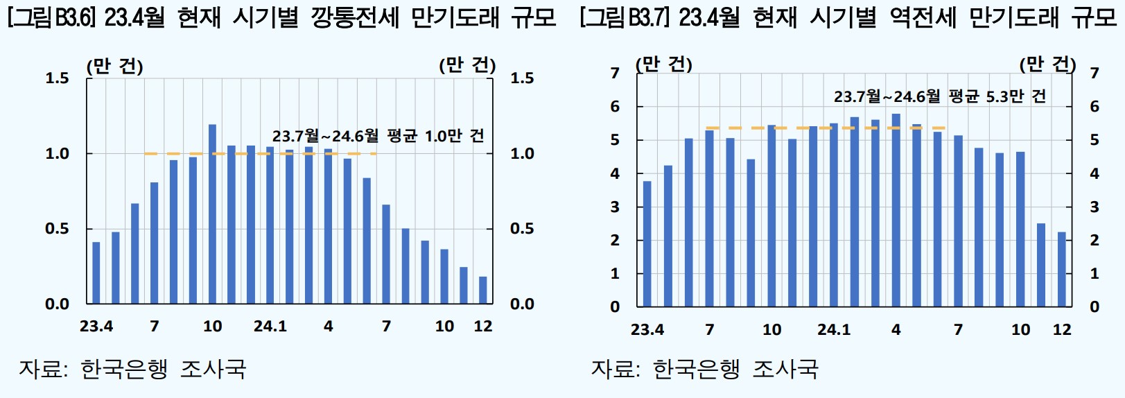 이처럼 깡통전세와 역전세의 비중이 높아진 것은 최근 몇 년간 주택시장의 변동성이 컸던 데 주로 기인하는데, 금년 하반기와 내년 상반기에 상당 부분 만기가 도래하는 것으로 나타났다. 23년 4월 현재 깡통전세 계약 중 금년 하반기와 내년 상반기에 만기도래하는 비중이 각각 36.7%, 36.2%이며, 역전세는 28.3%, 30.8%인 것으로 분석된다.