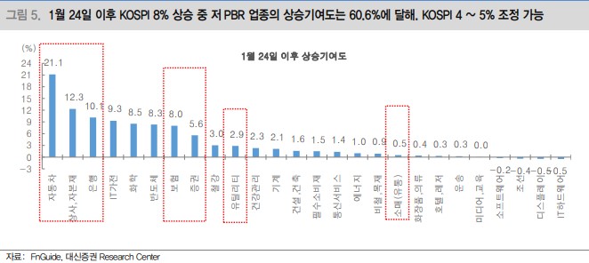 특히, 이번 밸류업 프로그램 기대가 가장 강하게 반영된 업종인 금융주와 현대차의 배당 기준일이 2월 29일에 집중되어 있다는 점도 경계해야 할 부분이다. 금융주와 자동차 급반등의 시작점이 이중 배당 기대였음을 감안할 때 배당락 이후 차익매물이 출회될 가능성이 높다. 기대감이 컸던 이슈가 현실화되는 과정에서 기대와 현실 간의 괴리가 축소되는 국면은 불가피하다. 이번 밸류업 프로그램에 대한 기대와 밸류업 지원방안 세미나 간의 간극은 우려했던 것보다 크다.