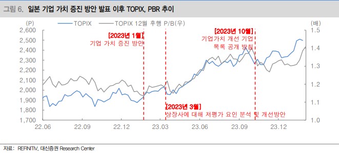 한편, 이번 밸류업 지원방안 공개를 통해 스튜어드쉽 코드 도입을 언급했고, 일본 사례를 첨부하 면서 향후 한국판 밸류업 프로그램이 일본 사례를 따라갈 것임은 더욱 명확해졌다. 향후 일본 사례분석을 통한 투자전략을 구체화해 나갈 필요가 있다. 그렇다고 서두를 필요는 없다. 일단은 저PBR주 변동성을 피하고, 수출/성장주 비중확대를 통해 수익률 제고에 집중할 때이다.