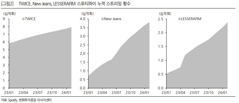 다만 스포티파이에서 확인되는 음원 스트리밍 지표는 앨범 판매량과 다소 상이하게 나타나는 중이다. 르세라핌의 경우 EASY 발매 이후 나타나는 스트리밍 지표 긍정적이다. 해당 음반 발매 이후 아티스트 전체 음원의 데일리 스트리밍 횟수는 커리어-하이를 기록 중이다.