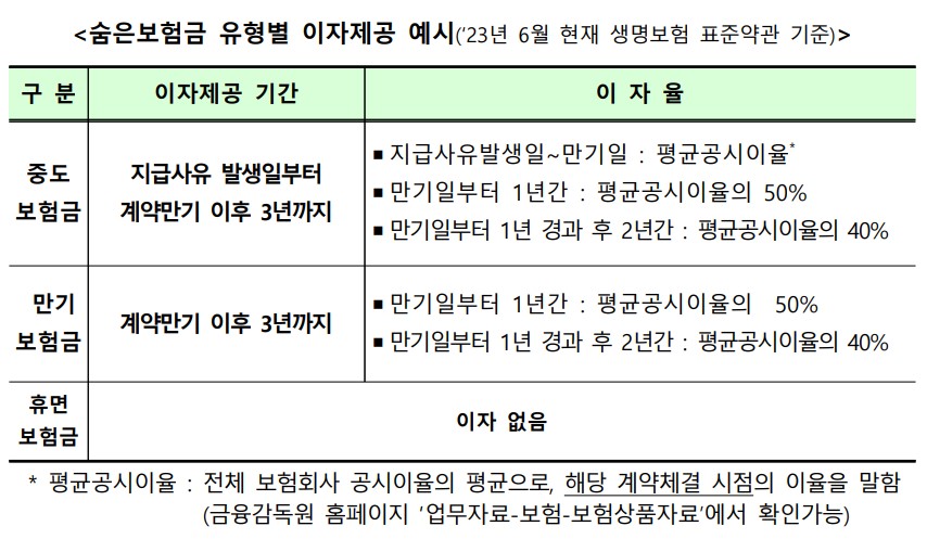 숨은 보험금에 대해서도 계약시점, 보험계약 만기, 만기일 이후 경과된 기간 등에 따라 개별 보험상품 약관에 명시된 대로 이자가 제공될 수 있다.